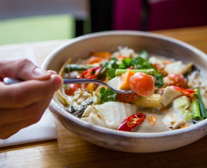 A super healthy and super tasty vegan curry, has really great flavours come through with the turmeric and basil coming through the curry itself. Appetizing additions of pumpkin, Thai eggplant, and cherry tomatoes add some needed body.
